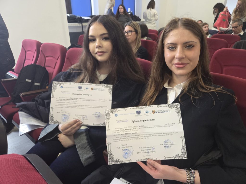 Sâmbăta, 28 martie 2026, două eleve din clasele a XII-a B, respectiv a XI-a B au participat la etapa municipală a Festivalului Național de Poezie “Gellu Naum”, organizat de Colegiul Național “Mihai Eminescu” din București. Evenimentul a reprezentat o modalitate prin care tinerii își pot manifesta creativitatea, originalitatea, simțul critic, redând prin cuvinte o infinitate de lumi.
